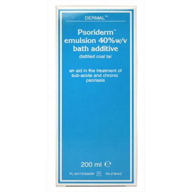 Psoriderm Bath Emulsion is a treatment for you to add to bath water when bathing. It helps treat a particular type of psoriasis that doctors refer to as sub-acute or chronic plaque psoriasis. This type of psoriasis involves areas of raised, red, sometimes itchy, patches of skin, covered with silvery scales (without any blistering or tenderness). The patches often occur on the elbows, knees, lower back and scalp. Psoriderm Bath Emulsion is recommended for use by adults, the elderly and children. The active ingredient in this product is distilled coal tar, which stops itching and restores normal skin development.Psoriderm Bath
